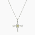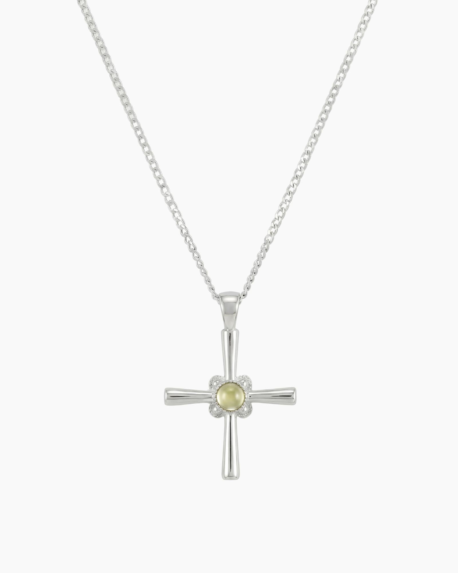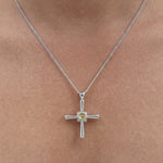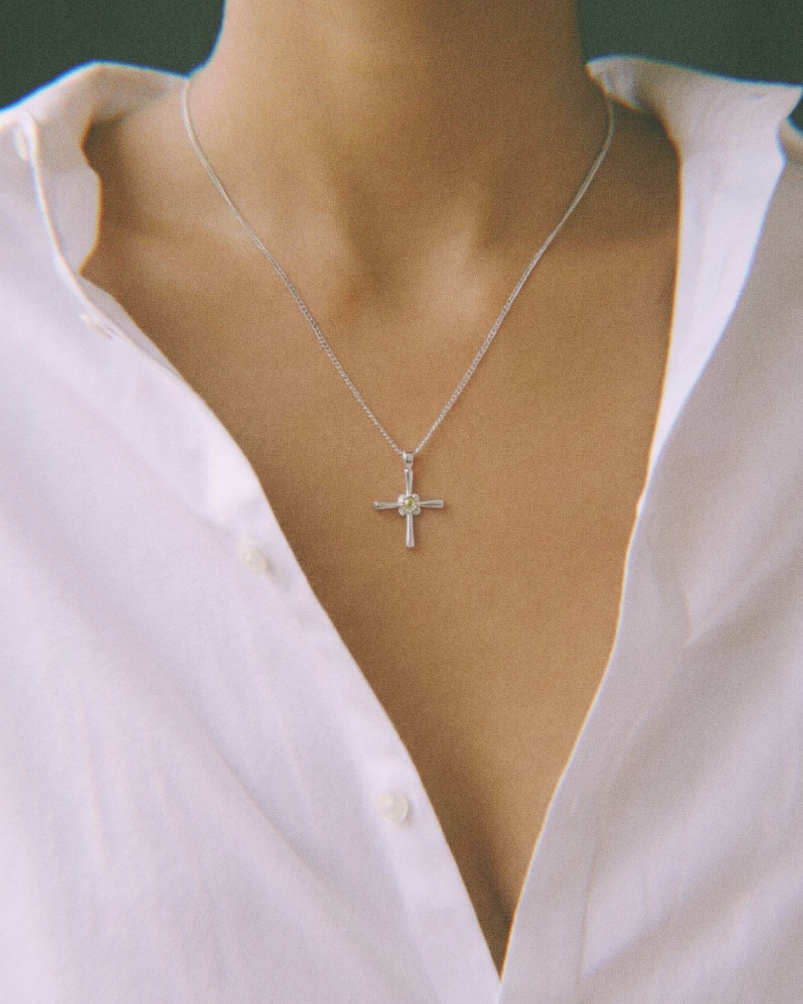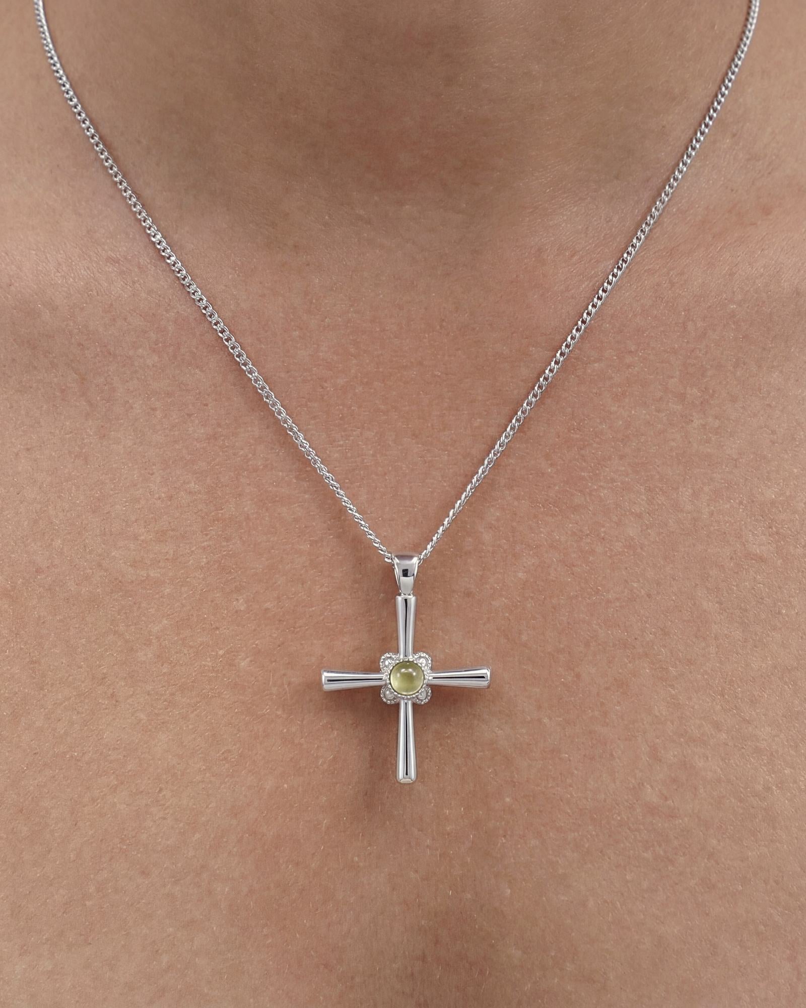 The Cathrina cross necklace is a dainty sterling silver cross necklace designed for everyday wear with modern, understated meaning. Featuring a polished cross pendant set with a dome-cut light peridot green cubic zirconia, it blends classic symbolism with a soft contemporary finish.